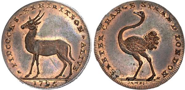 London, Strand, Gilbert Pidcock Halfpenny 1795, Antelope standing left, rev. an ostrich walking left, edge plain, 28mm/10.92gm. (DH 447a). Gem UNC with much original mint lustre.