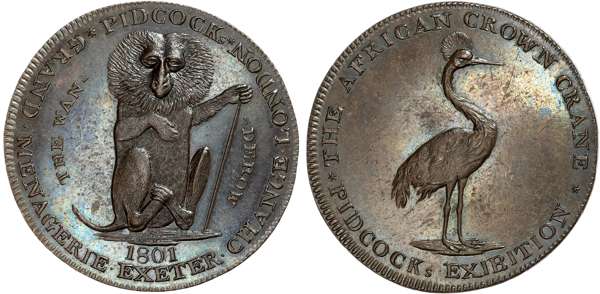 London , Strand, Gilbert Pidcock Halfpenny 1801, A Wanderow (Lion-tailed macaque), rev. A crane standing right, edge plain, 30mm/9.61gm. (DH 458). Good Extremely Fine, toned with bluish iridescence, scarce.
