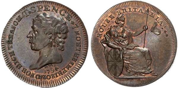 London, Holborn, Thomas Spence Halfpenny 1794, Head of Spence left, rev. Britannia seated r., losing cap of liberty, edg …