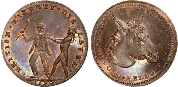 London , Holborn, Thomas Spence Halfpenny 1796, A landsman being press-ganged into the Navy, rev. the Head of Geo. III conjoined with that of an ass, edge PAYABLE IN LONDON rest engrailed, 29.5mm/9.43gm. (DH 734). Well struck, Gem UNC, beautiful rainbow iridescence with much original lustre, superb and rare.