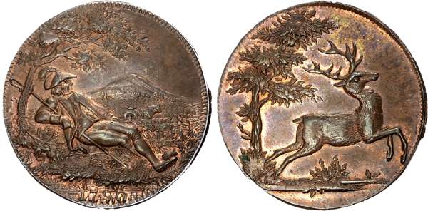 London, Holborn, Thomas Spence Halfpenny 1790, A stag bounding past a tree, rev. Shepherd lying under a tree, edge , pla …