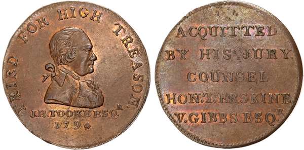 London, Political Series , John Horne-Tooke Halfpenny 1794, Draped bust right, rev. 5-line legend re. his acquittal, ed …