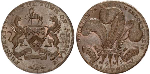 Norf. Aylsham , Stephen and Thomas Ashley (wine and brandy merchants) Halfpenny 1795, Grocers’ arms rev. Prince of Wales …