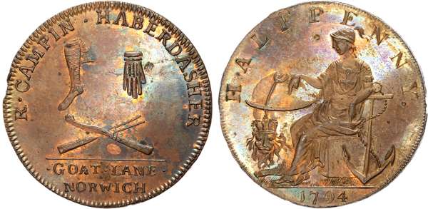 Norf. Norwich , Robert Campin (haberdasher) Halfpenny 1794, Stocking, glove, knife and fork, rev . Britannia in the form …
