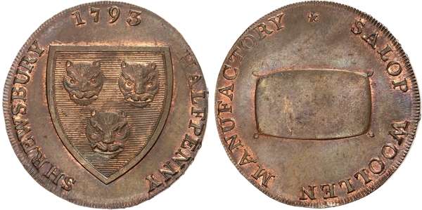 Salop . Shrewsbury , Isaac Wood (watchmaker & printer) Halfpenny 1793, Arms of Shrewsbury, rev. wool pack, edge PAYABLE AT SHREWSBURY + +, 30mm/11gm. (DH 22). Gem UNC with good iridescence and a fair bit of original mint lustre.