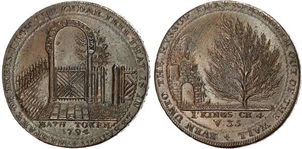 Som. Bath , John Jelly, Lutwyche’s penny 1794, gate to Botanic Gardens, rev . Hyssop bush by ruin 30mm/19.79gm. (DH 5), UNC, toned with underlying brilliance, scarce.