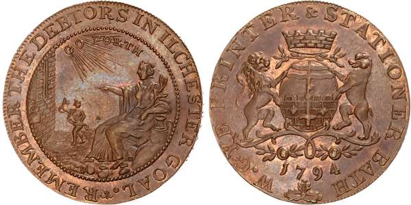 Som . Bath , William Gye (bookseller, printer and stationer) Halfpenny 1794, Arms of Bath, rev. Benevolence instructing the opening of gaols, edge PAYABLE AT W. GYE’S PRINTER BATH X.X, 29.25mm/9.71gm. (DH 34 ). Gem UNC, toned but with much original lustre.