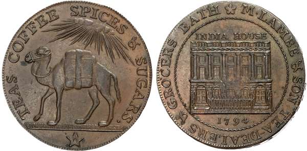 Som. Bath , Mary Lambe & Son Halfpenny 1794, View of India House, rev. Camel standing left, rayed sun above, edge PAYABL …
