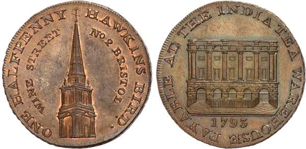 Som. Bristol , Hawkins Bird (grocer and tea dealer) Halfpenny 1793, Spire of Christ Church, rev. façade of the India te …