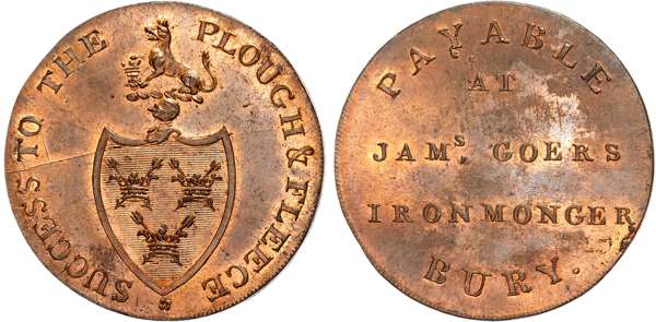 Suff. Bury St. Edmunds, James Goer, (ironmonger) Halfpenny undated, Arms of the town, rev. 5-line legend, edge plain, 29 …