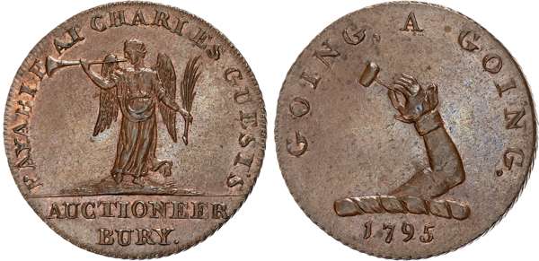 Suff. Bury St. Edmunds , Charles Guest (auctioneer) Halfpenny 1795, Arm with gavel crest, rev. Fame blowing trumpet left …