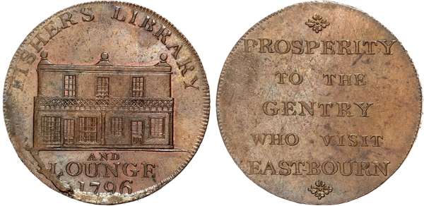 Suss. Eastbourne, Frederick Fisher, (bookseller and library owner), Halfpenny 1796, View of library, rev. 5-line legend …