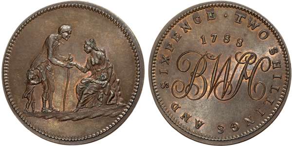 Warks . Birmingham, Workhouse, Two-Shillings and Sixpence 1788, Charity seated, giving alms to an old man and a boy, a child kneeling by her side, rev cypher B W H, 1788 above, TWO SHILLINGS AND SIXPENCE around, edge plain, 36mm/19.15gm. (DH 1), Gem UNC, sharp strike with even toning, brilliant with more than a trace of original red, superb. rare.