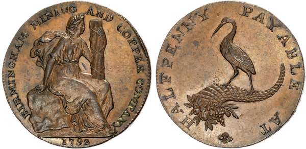 Warks. Birmingham , Birmingham Mining and Copper Company Halfpenny 1792, Commerce seated right holding fasces, rev. Stor …