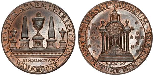 Warks. Birmingham , James Bisset (proprietor of museum and marble warehouse) Halfpenny undated, view through a colonnade with miniature pictures either side, rev. stone monuments – pyramids and urns, edge plain, 29.75mm/10.24gm. (DH 120). Gem UNC, proof-like with much original mint lustre.