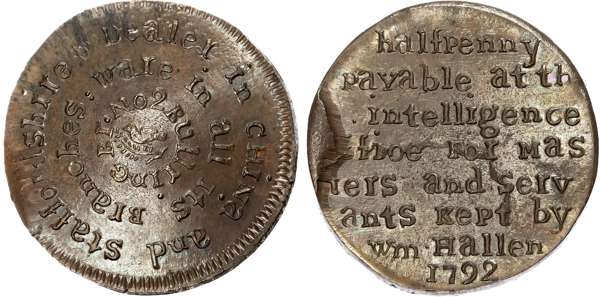 Warks. Birmingham , William Hallan (china dealer and servant finder), Halfpenny 1792, Circular legend with bird in midd …