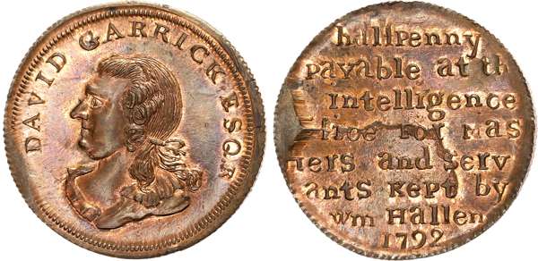 Warks. Birmingham , William Hallan, Skidmore’s mule Halfpenny 1793, Draped bust of David Garrick left, rev. 8-line legen …