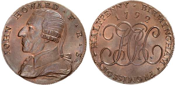 Warks . Birmingham , Henry Hickman, (ironmonger) Halfpenny 1792, Bust of John Howard, the prison reformer, rev. HH cypher, edge PAYABLE AT H. HICKMANS WAREHOUSE BIRMINGHAM, 29mm/12.14mm. (DH 144). Gem UNC, even toning with residual lustre and some iridescence, graded by NGC as MS 64 RB.