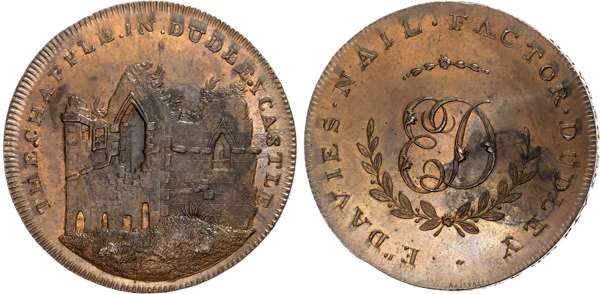 Worcs. Dudley , Edward Davies, Skidmore’s Penny 1797, view of the ruinous Chapel in Dudley castle, rev . ED cypher in laurel wreath, ED DAVIES NAIL FACTOR DUDLEY, edge I PROMISE TO PAY ON DEMAND THE BEARER ONE PENNY, 35.25mm/24.51gm. (DH 4), Gem UNC, as struck, evenly toned with some original colour, scarce .