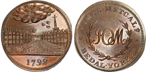 Yorks. Bedale, James Metcalf, Skidmore’s Halfpenny 1792, View of a terraced street, church behind, rev . JOM cypher in wreath, edge plain, 30.75mm/10.57gm. (DH 9c) , Gem UNC, proof-like with brightness, reflection and much original mint lustre .