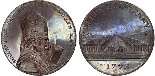 Yorks. Leeds , Henry Brownbill (silversmith, watchmaker) bronzed proof Halfpenny 1793, Bust of Bishop Blaze with woolcom …