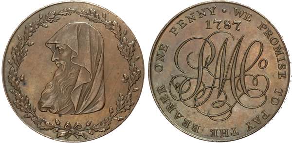 Ang. Amlwch, Parys Mines Co. Penny 1787, Cowled druid’s head within a thin oaken wreath with 22 acorns, rev . PMCo cyphe …