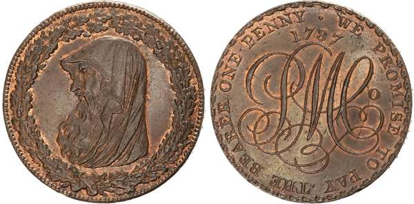 Ang. Amlwch, Parys Mines Co. Penny 1787, Cowled druid’s head within a thick oaken wreath with 4 acorns at tie rev . PMCo cypher, edge ON DEMAND IN LONDON LIVERPOOL OR ANGLESEY, 33.5mm/28.65gm. (DH 84), Gem UNC with even toning and some iridescence and fair amount of original mint lustre.