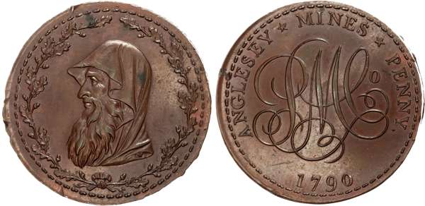Ang . Amlwch, Parys Mines Co. Penny 1790, Cowled druid’s head, W on truncation, within a thin oaken wreath with 20 acorn …