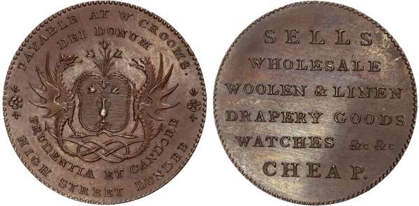 Angus. Dundee, William Croom (draper), Kempson’s Halfpenny (mid 1790s), Arms and supporters of town, period after Dunde …