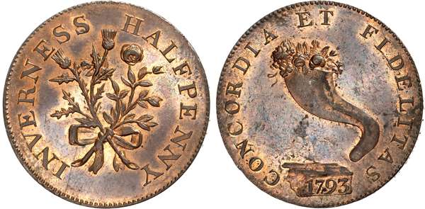 Inver. Inverness, Mackintosh, Inglis & Wilson (sailcloth and sacking manufacturers) Halfpenny 1793, Cornucopia over the Cudden Stone, rev. thistle and rose united, edge PAYABLE AT MACKINTOSH INGLIS & WILSON’S. 29mm/11.76gm. (DH 1a). Gem UNC toning but with almost half original mint lustre.