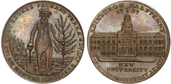 Loth. Edinburgh , Anderson, Leslie & Co. (nurserymen and seedsmen), Wright’s Halfpenny 1797, view of façade of the ‘new ‘Edinburgh University, rev . gardener standing holding spade and sapling, edge plain, 28mm/10.68gm. (DH 7), choice UNC, toned but with much underlying brilliance and iridescence.