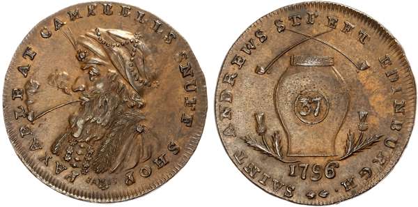 Loth. Edinburgh , Euphame Campbell Halfpenny 1796, Turbaned Turk’s bust left, smoking a pipe, rev . Tobacco jar marked …