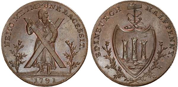 Loth. Edinburgh, Thomas and Alexander Hutchison Halfpenny 1791, St. Andrew holding cross, thistle either side, rev . arm …