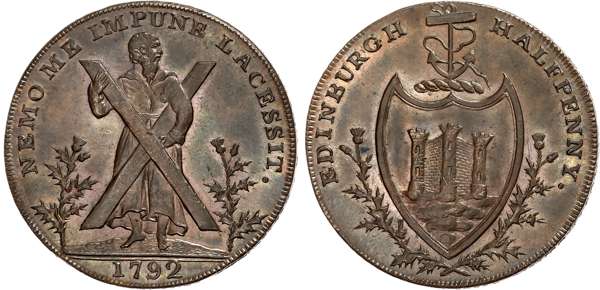 Loth. Edinburgh, Thomas and Alexander Hutchison Halfpenny 1792, St. Andrew holding cross, thistle either side, rev . arms of Edinburgh in wreath of thistles, anchor crest, edge PAYABLE AT THE WAREHOUSE OF THOS & ALEXR HUTCHISON, 29.75mm/12.68gm. (DH 44). UNC, reflective toning with just a trace of original mint lustre.
