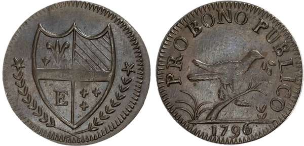 Loth. Edinburgh , anonymous issue Farthing 1796, fictitious arms in wreath, rev . dove with olive sprig on branch, edge …