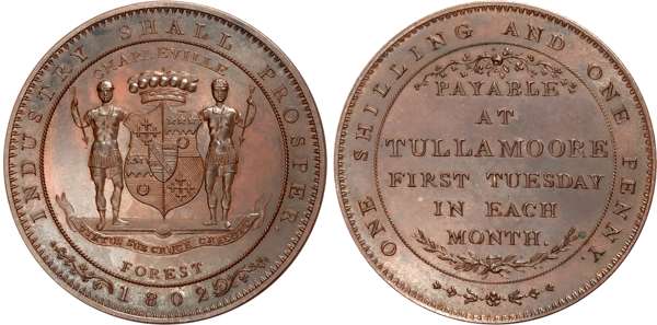 Kings Co. Tullamoore, Charles Bury, viscount Charleville (estate owner) Thirteen Pence 1802, Arms and supporters of Charleville, rev. 6-line legend, edge plain, 36.25mm/23gm. (DH 2). Choice UNC, bronzed with underlying lustre, rare.