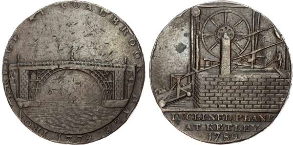 Salop. Coalbrook Dale , Reynolds & Co, Pattern or Trial Halfpenny 1792, in copper, View of the Iron Bridge, no barge on river, rev. Man working at inclined plane, edge PAYABLE AT COALBROOK-DALE AND KETLEY, 30.25/12.84gm. (DH 4). Good Very Fine, toned with minor knocks, very rare ‘RR’.