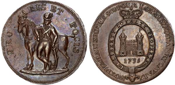 Suff . Bury St. Edmunds, Philip Deck Penny 1794, Bust of Cornwallis, rev . Figure of Fame, edge VALUE ONE PENNY AT P. DECKS POST OFFICE BURY, 33.5mm/17.30gm. (DH 4). Hoxne , Thomas Tallant Penny 1795, Yeoman leaning against horse, rev . Castle in crowned garter, edge plain, 31.5mm/20.15gm. (DH 6a). Woodbridge , Robert Loder Penny 1796, Bust of Thomas Sekford, rev. Shield of arms, edge PUBLISHED BY R. LODER 1796, 34.5mm/18.85gm . (DH 15). First two Extremely Fine and toned, third good Very Fine. [3]