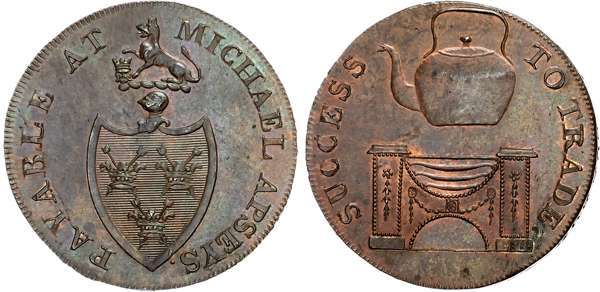 Suff. Bury St. Edmunds . Michael Apsey, (ironmonger and tinman) Halfpenny undated, Arms of the town, rev. Kettle over fi …