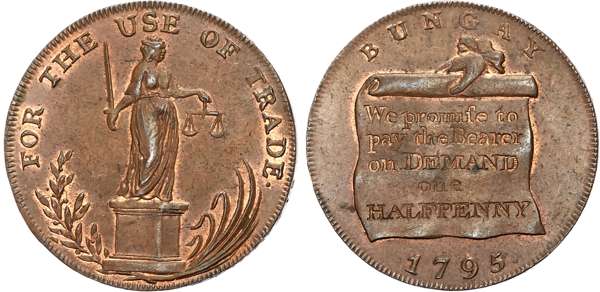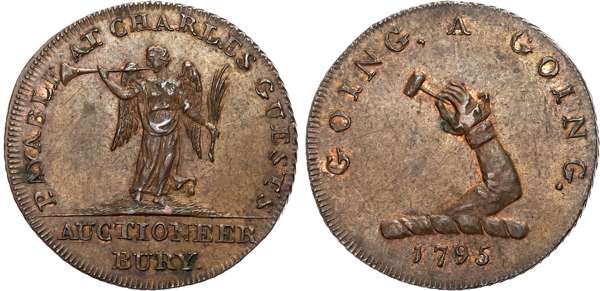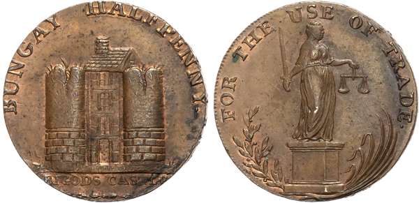Suff. Blything , Sir John Rous Halfpenny 1794, Mounted Yeoman, rev . Castle in crowned garter, edge GOD SAVE THE KING AND CONSTITUTION, 30.2mm/11.94g. (DH 19). Bungay , Samuel Prentice Halfpenny 1795, Hand holding scroll, rev . Justice standing, edge S. PRENTICE S. DELF M. ABEL, 28.8mm/9.51gm. (DH 21). Bungay , another, Remains of ancient fortress, rev . Justice standing, edge PAYABLE BY SAMUEL PRENTICE, 27.7mm/10.76gm. (DH 23). Bury St. Edmunds , Philip Deck Halfpenny, Arms of Bury, rev. PD cypher above crown, edge PAYABLE AT P. DECKS POST OFFICE BURY, 28.9mm/10.70gm . (DH 26). Bury St. Edmunds , another, Charles Guest, Arm holding hammer, rev. Figure of Fame , edge milled, 28.8mm/8.58gm. (DH 30). All Extremely Fine or better with traces of original lustre. [5]