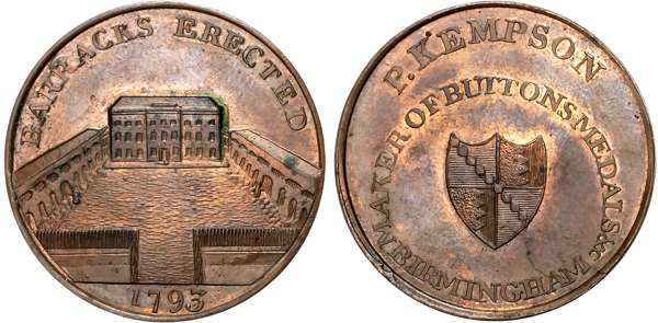 Warks. Birmingham, Kempson’s series of Birmingham Buildings, Halfpence, Barracks, 11.44gm. (DH 177), Blue School, 11.85g …