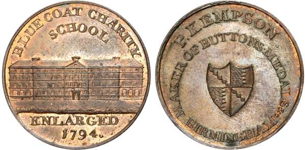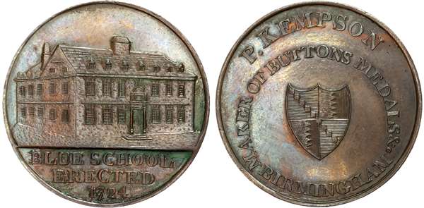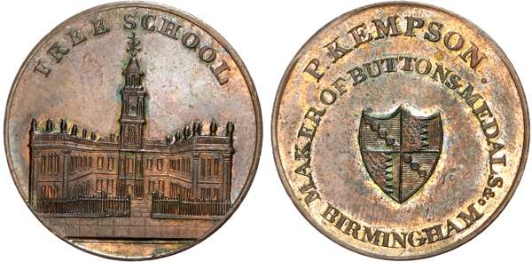 Warks. Birmingham, Kempson’s series of Birmingham Buildings, Halfpence, Barracks, 11.44gm. (DH 177), Blue School, 11.85gm. (DH 194), Blue Coat Charity School, 10.74gm. (DH 197a), Free School, 9.69gm. (DH 200), revs . Arms of Birmingham, edges plain. All good Extremely Fine, evenly toned with more than a trace of original colour on each. [4]