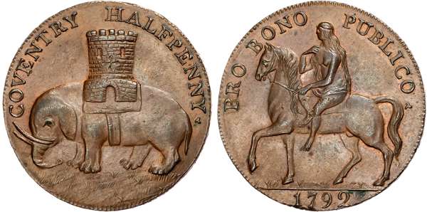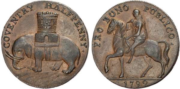 Warks. Coventry , Robert Reynolds & Co. (ribbon weaver and seller) Halfpenny 1792, Lady Godiva on horse, rev. Coventry a …
