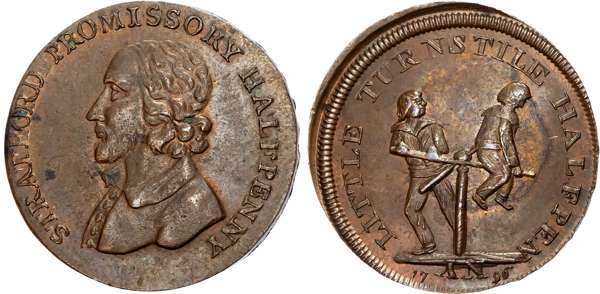 Warks . Stratford-on-Avon , Skidmore’s mule Halfpenny undated, Draped bust of Shakespeare left, rev. Two boys on a turns …