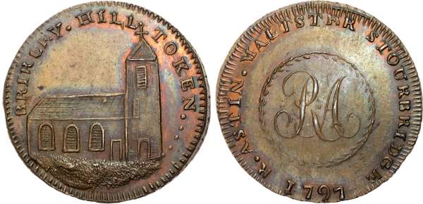 Worcs. Stourbridge , R. Astin, Skidmore’s Halfpenny 1797, View of St Michael’s Church, Brierley Hill, rev. RA cypher in …
