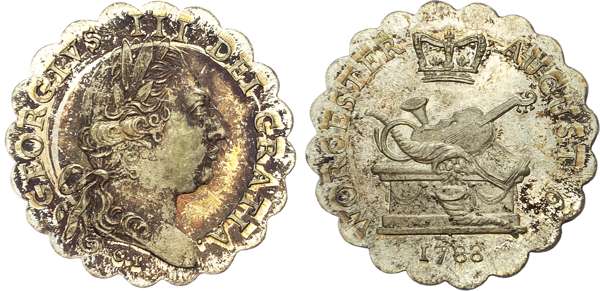 Worcs . Worcester, George III silvered ‘medalet’ Farthing 1788, Bust right of George III with C.I below bust, rev. crown …