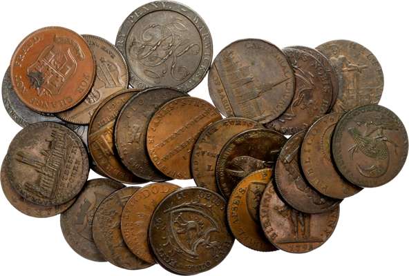 Lot of 28 English 18th. century tokens from Bath, Bury St. Edmunds, Birmingham, Brimscombe Port, Bristol, Cambridge, Canterbury, Havering, Hendon, Hoxne, Lamberhurst, Liverpool, Leeds, London, Norwich and Spalding. Generally about Extremely Fine. [28]