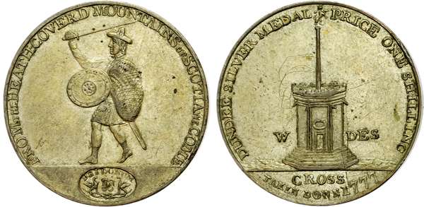 Angus. Dundee, James Wright Jr. silvered copper Shilling 1797, Ancient market cross, rev. An armed highlander in kilt with sword and buckler, edge plain, 23.5mm/5.99gm. (DH 4). Some light scratching by cross otherwise Extremely Fine with hazy patination, extremely rare, ‘RRR’. .