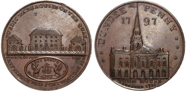 Angus. Dundee , Thomas Webster Jr., Wright’s Penny 1797, Quay warehouses above Dundee arms, rev . Frontal view of the To …