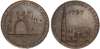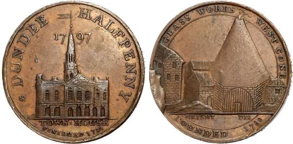 Angus . Dundee , John Pilmer (grocer), Wright’s Halfpenny 1797, Glassworks and cone, rev, Facade of town hall, edge PAYA …